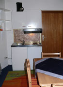 Zwei-Platten-Herd, Kühlschrank, Spüle, Geschirr,